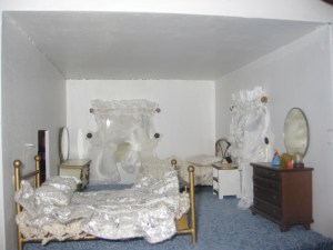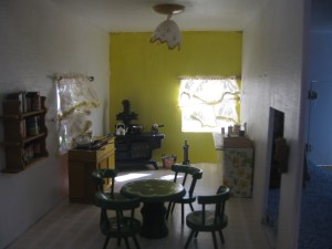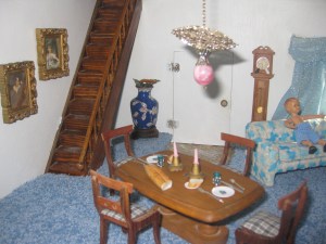 It had been in storage for 15 years and was an absolute mess. The paint was chipped and a window sill had broken off. The original 70’s shag carpet was matted and disgusting. The linoleum in the bathroom was curled. I did have, however, all the original pieces that came with it. As I scrubbed it, repaired it, and painted it with the help of my niece and her husband all the memories came out and I shared them with my assistants. The house was made by my grandfather and carefully measured to the scale of 1″ to the foot. The beautiful staircase and railing was made by my great-grandfather. All the curtains had been sewn by my grandmother.