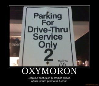oxymoron [(ok-see- mawr -on)] – A rhetorical device in which two seemingly contradictory words are used together for effect: “She is just a poor little rich girl.” (Dictionary.com)