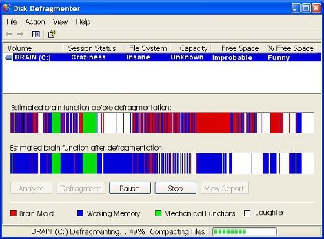 Some how my brain seems to be going through the defrag process. As each memory, piece of knowledge or conversation is pulled out, evaluated and put away my brain feels a little more calm and clear. The fact that my unconscious brain seems to be handling this fills me with mixed emotions. I’m glad that I don’t have to focus on each memory as it is pulled because some of them are very painful. At the same time, I have no idea how this filing systems is set up. Lately, random words have been coming out of my mouth: I’m sorry. Done with that. Stop it.
